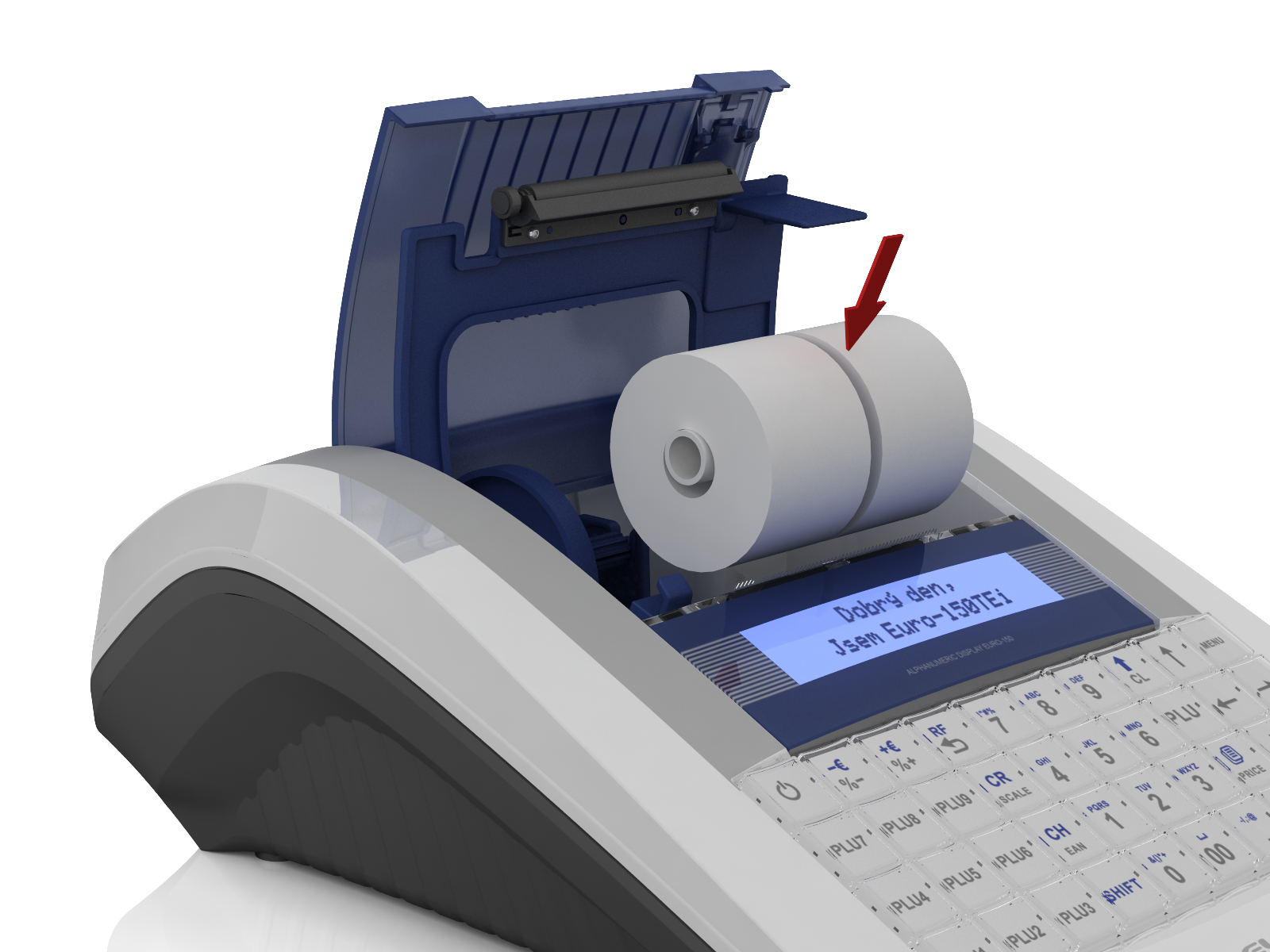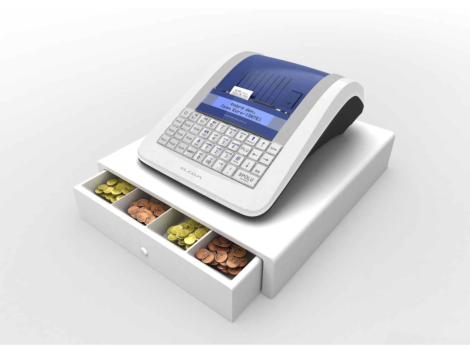 - elegantní bílá Euro-150 Flexy má přehledný podsvícený displej a umožňuje programování položek pro všechny prodávané výrobky,
